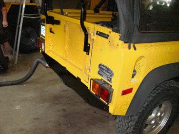 Now that the 4.6 install is complete we turn our attention to the rear of the D90 to prevent rust. The thin factory paint on the rear crossmember of this 90 baked off in the sun a long time ago. To protect the rear crossmember we have taken the crossmember down to bare metal, as seen above. We then treat the steel to prevent rust. Next we apply numerous coats of epoxy primer and multiple coats of PPG black paint. This will make sure the rust stays away, and will make the D90 look better cosmetically as well.