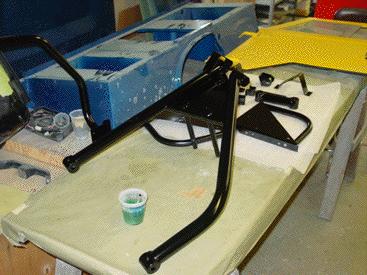 This image shows all the rear tire carrier parts brought back to rust free, white metal, hanging in our spray/bake booth. Before priming the parts are treated with a rust stop procedure, then coated in 3 coats of epoxy primer and 3 coats of PPG stain black. This gives a factory look, but with much better rust prevention than the factory pieces, and if they do rust they can be easily touched up, unlike powder coating, and unlike powder coating these parts will never "peel" again.