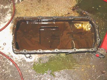Once the 3.9 has been stripped down you can start to see what happened to the engine. In this engine's case it was a combination of things, one of them being sludge build up and old oil. The sludge in the bottom of the 3.9's oil pan was over and inch deep and nearly blocking the oil pick up tube. The good news is that an ECR 4.6 comes complete with a new oil pan, so this mess is history.