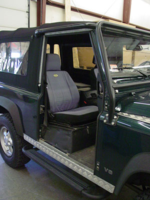 This 90 has a lot of nice upgrades already, from new seat covers to a Badger top. It also had upgraded door hinges that were black and just didn't look right against the beautiful British Racing Green paint, so we have removed the hinges and are priming and painting in the correct color for a more finished look. We will also be adding a killer Alpine sound system, adding an on-board air system and doing some routine work.