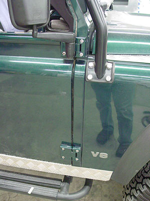 Here you can see the customers door hinges have now been painted in the correct color and have been re-installed on the 90 using stainless hardware. This helps these after-market hinges blend in better and gives the Rover a much more finished and professional build quality look.