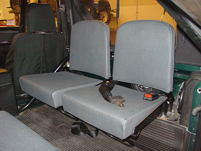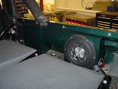 The owner of the Defender also wanted some great sound from his 90, and with as small as the interior is in a D90 that can be hard to do. Luckily the latest in subwoofer technology and our custom fabrication abilities give us the opportunity to set this 90 up with a large Alpine digital amplifier and two 8" subwoofers, four 6.5" speakers, keep the floor space open and keep the 4 jump seats! Yes it can now be done. Here you can see the newly constructed subwoofer box on the RH side that has an 8" subwoofer driven by the Alpine digital amp, the sister box resides in the same place on the LH side. We have painted the box in the correct British Racing Green body color so that it blends in perfectly and looks factory. The image above shows the unit before the jump seat backs go back in place because once the seats go back into place...