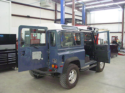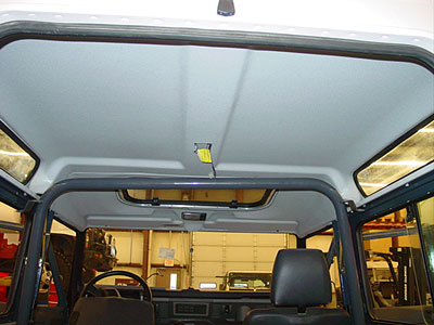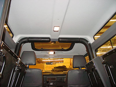 Here you can see the interior now completely back together. The headliners and trims are in place and it all looks like a 5400 mile Defender should.