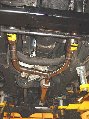 Another upgrade that helps make the most of the new 4.6 and adds longevity is the ROX exhaust system we have just installed. The system is made from thick wall 304 stainless steel with stainless steel laser cut flanges. It runs muffler of our own design that increases ground clearance and adds a nice mellow rumble to the exhaust along with increasing performance. The catalytic convertors are state of the art Random Technology metal matrix units that will not fall apart and fail down the road like a standard convertor. The tailpipe exit is closer to the vehicle as well so that you can squash it when off roading. It is the best and last exhaust system you will ever buy for your V8 Defender.