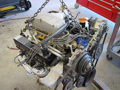 Here you can see the old 3.9 out and ready to go to an engine stand to surrender its parts that we will re-install onto the new, not rebuilt, Rover 4.6 liter engine.