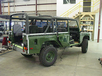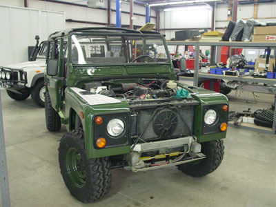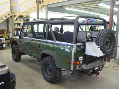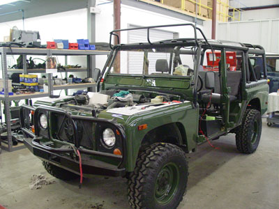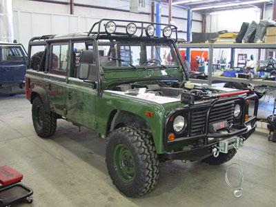 This image shows the BR110 a little further along with its new suspension springs installed to give it a mild lift. The ROX sliders have been installed as well, along with the hood mounted spare tire. At this stage everything is up and running, so while the final details get installed all the systems are being road tested to make sure there are no problems when the Defender reaches its new home in CO.
