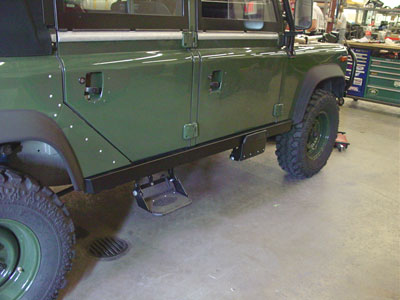Here you can see the ROX sliders better and you can also see the folding side steps that we have added to make getting in and out easier for the owner and his guests. If the Rover is going to head out for some rough terrain the side steps can be unbolted in short order.
