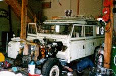 With the new door supports, restored bulkhead and the rest of the frameand drive line assembled this one owner 109 is starting to look good again.(Notice the restored bulkhead, rust free). Now back together and rust free,this 109 12 seater Station Wagon is ready for another trip around the world.This time with a galv. frame, Defender 110 axles, 4 wheel power disc brakes and more.