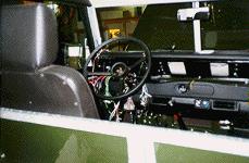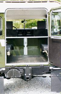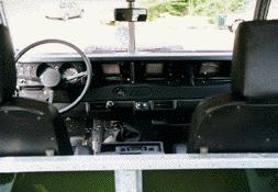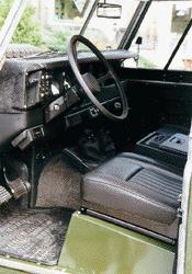 The completed interior. Notice that we have modified a Defender style Air Conditioning set up to work in this SIII, and installed custom Badger Coachworks high back seats, Clarion 6 disc CD changer, Defender door panels, JBL speakers, all new and all restored.