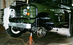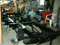 The back bone of any restoration is the frame. In this case a HD galvanizedcoil chassis (painted black to give the original appearance), 4 wheel discbrakes, Range Rover axles, etc. ready for the drive train.