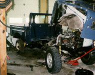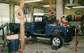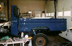 In this image you can see our base model 110 Hi-Capacity pick up. The 3.9 liter V8 5 speed running gear has already been assembled and the freshly painted Arles Blue panels are being fitted to the new galvanized chassis. The frame was painted black on this 110 to give a factory look to the project.
