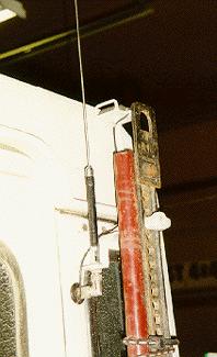 The mounts we fabricated for the remote GPS antenna, the CB antenna and the Hi-Lift jack was combined into one unit. The Hi-Lift mounts to the bumperette at the bottom and then to a stud that sticks out on the bracket. The stud uses a lug nut as the clamp so you are always assured of having the right size wrench to get the Hi-Lift off. The vertical, rear mounted position keeps the Hi-Lift in place, out of the way from off road obstacles and keeps it from rattling around.