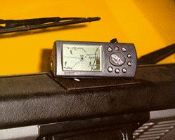 First up was the GPS. We choose the GPS III Plus for a host of reasons (GPS units are a matter of personal taste, so check with your sales staff, or research GPS units on the internet). The GPS III runs off the vehicle's electrical system so we don't have to worry about small batteries and it also has the ability to take a remote mounted antenna. The remote antenna give you much better signal reception, especially with these smaller GPS units. We fashioned a mount for the top of the Defender dash pad that replaced the factory ash tray with no modifications. The mount swivels so that the driver and passenger can easily access the GPS, and if field work is ever required the GPS itself is held to the mount with Velcro so it can be easily removed. I can now say that after 6300 miles in ECR 4 from maine to Utah and back, the GPS mount works great and I am pleased with the GPS III Plus.