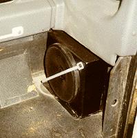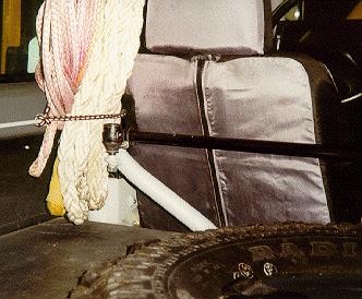 For speakers we used 4 (2 in the rear in custom aluminum boxes and 2 in the factory door panels up front) Rockford-Fosgate 6" speakers with baffles and custom boxes. True, this system isn't going to win any stereo competitions, but it is simple and robust for off road use, and gives very good sound, even over the hum of 35" Super Swampers. Notice that the speakers are also protected by "roll cages". These keep your speakers in tact when you toss your tool box in the back and accidentally hit the speaker.