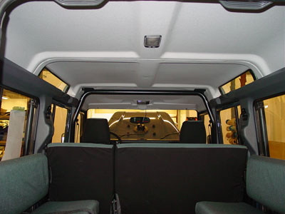 Here you can see the updated rear door and rear door interior panel. This set up is much stronger and longer lasting than the original 1993 parts, and looks better as well. You can also see the new jump seats and the cargo area tie downs that we have installed in the rear as well.