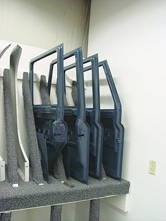 The doors on a Defender 110 have steel frames in them as well, so all the doors are replaced with new door shells. Here you can see new 4 side door shells have been primed and painted as well. Next up these doors will be assembled with all new guts and made ready for when the body structure comes together.