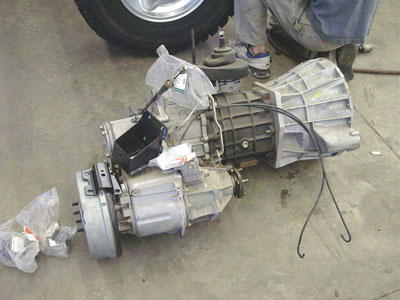 Here you can see the new version R380 gearbox mated to the 1.4 ratio transfer case. Once we get the new mounts installed on it we will mate it to the engine and then installed the entire drive-line into...