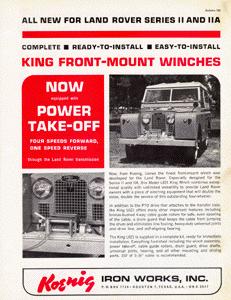 Much like today, where the owners of new Defender 90s and Discoverys add numerous options to personalize their Rovers, vintage Rovers had numerous options that could be added. However most of these options related to "work" and not so much towards "flash" as in today's market. We have all seen the Defender 90 that has every option for off road use, when unfortunately the closest it gets to off road are the speed bumps in the mall parking lot. One of the popular, and now sought after, vintage Rover options was the PTO (Power Take Off, meaning engine driven) winch made by Koening Iron Works, Inc. in Houston, Texas. Below are images of the original 1960's Koening brochures.