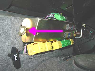 The flasher relay is located behind the fuse panel support in the location marked by the purple outline, but you can't reach it (or at least we can't).