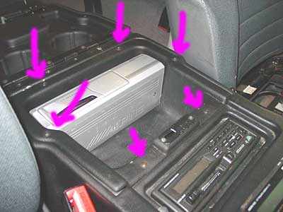 Remove the cubby box tray and remove the three 8mm headed bolts that hold the consoles rear bracket to the seat box.