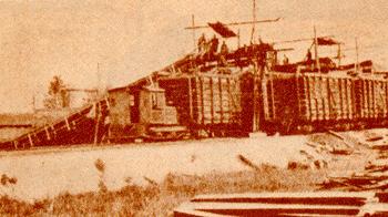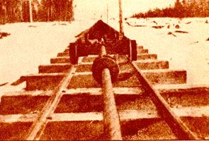 A conveyor belt system was built at Eagle Lake to load the cars with the winter's waiting pulpwood. The loaded cars would then be hitched to the locomotive for the trip to Umbazooksus Lake.