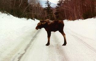 On our return toward Greenville one of the locals, a yearling moose, decided that the road was a much better place to walk, rather than trudge around in the snow, and it took him a few minutes before he decided that we were OK to let through. In a last minute change of heart he had a quick lunge at the fender of the lead Defender, but he thought better of it and headed off into the woods.