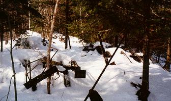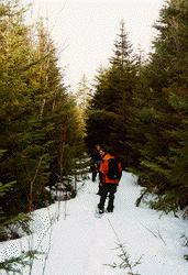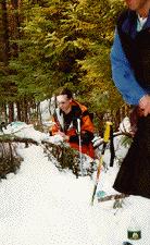 The snow was over well 3 feet deep in most areas, and around fallen trees the snow does not compact as it does in open areas so you have to watch your step or you sink, even with snowshoes. Actually in conditions such as these you can't walk in anything but snowshoes. Jason and the rest of us found a number of spots on the trail that sucked us in. In this image Jason is still standing on the tree in this loose powder spot, if he stood on the ground he'd go up to his chest. The benefits of walking poles in these conditions are great, they can really save fatigue and help get you out of holes. For the roughly 4.5 miles into the lake we averaged about 1.5 miles per hour slogging through the now wet and heavy snow.