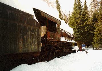 A small clearing is around the two engines and they still sit side by side in what used to be the repair shed, just as they did when their boilers were shut of over 70 years ago. It appears that the repair shed has burned down around the engines as fire damage can be seen on both locomotives. After the long hike we take a break near the trains and Geoff can't resist getting behind the controls and playing "engineer" with his head out the window of engine one. Our thoughts turn to restorations and dreams of making the engines live again, but after a few minutes talk we realize why the engine were left here in 1930 and we sit back to just enjoy them before we have to start back out before darkness arrives.