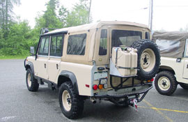 - 2 door soft top/ hard top SR110: This is the basic 2 door Defender 110 with a soft top roof and open back that can be left open to haul gear, or set up with seating for up to 10 people. Great for sporting needs, going to the beach or carrying a lot of gear. The ECR SR110 is the ultimate tour vehicle with its adventure ability and massive seating capability. It can be a "no top", "soft top with roll up sides" or a "full hard top" depending on what option you choose.